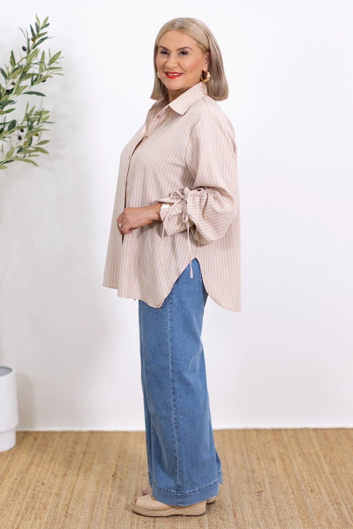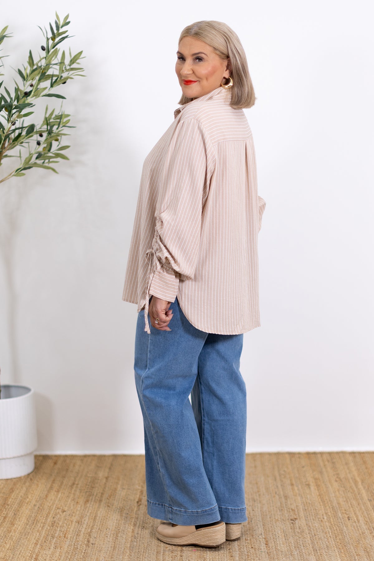The Laura Oversized Striped Shirt combines timeless design with modern accents — from its statement sleeves and wide split cuffs to the delicate side gathering and bow detailing.