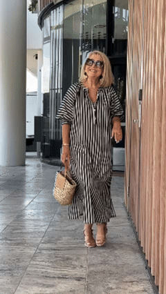 Introducing our Striped Buttoned Vacation Dress, designed for the modern woman who values sophistication and style. This dress features a stunning print and elegant maxi length, making it perfect for any occasion.