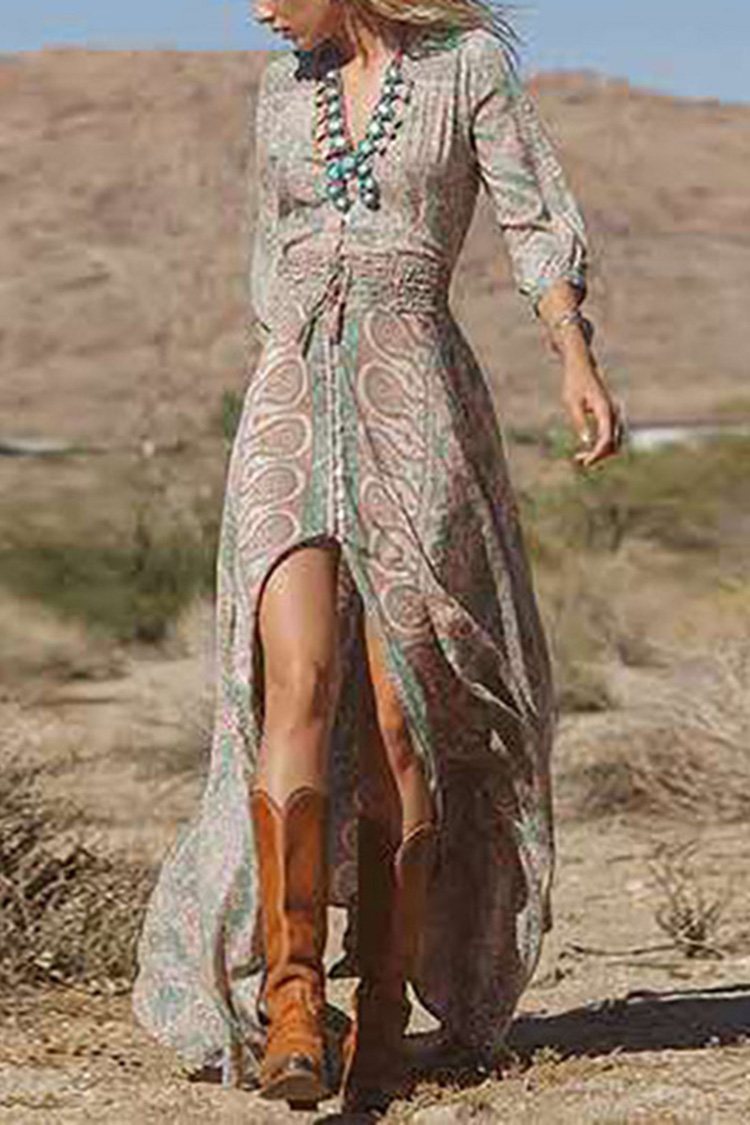 VChics Western Style Boho Print Slit Maxi Dress